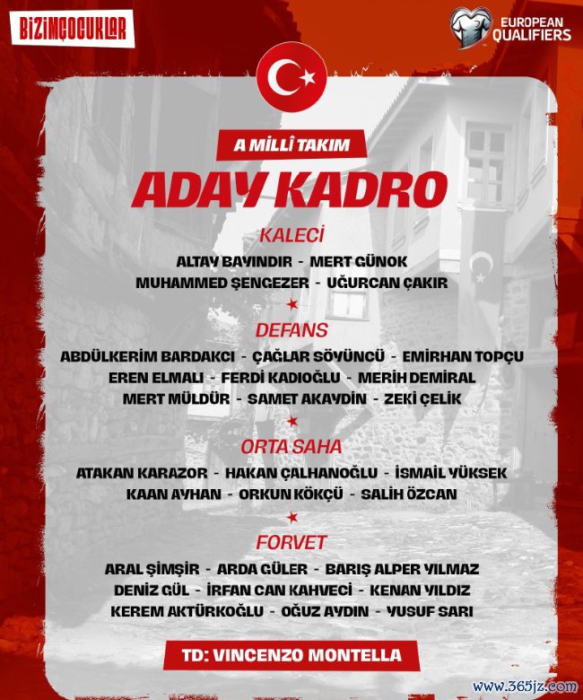 北京工夫11月7日,土耳其公布11月寰宇杯欧洲预选赛的大名单。法兰克福中场詹-乌尊因伤缺席,亚洲欧洲在线播放里尔门将厄泽尔也未能入选。土耳其将在11月世初赛中对阵保加利亚和西班牙。