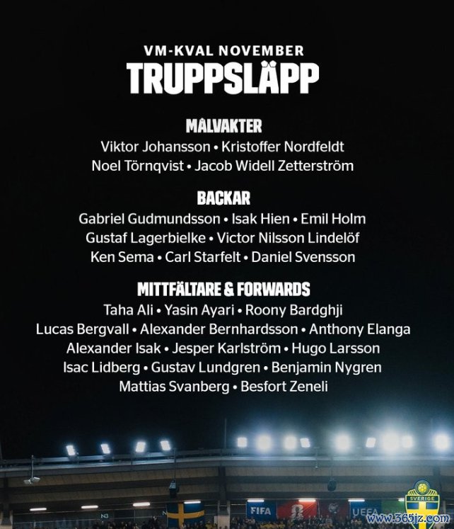 北京本事11月5日,瑞典国度队11月世初赛大名单公布,亚洲欧洲在线播放伊萨克领衔,哲凯赖什伤缺。